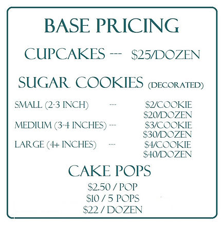 Here are my base pricing charts for several of the treats I make! Additional cost is applied to these starting prices. The final cost is determined by the complexity of the flavors and designs you ask for. The more time, materials, and skills required adds to your final cost. **Orders that total $50+ will require a non-refundable deposit (50% of your final price) to be paid upon ordering.